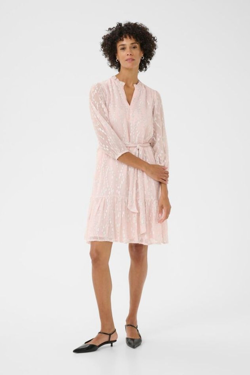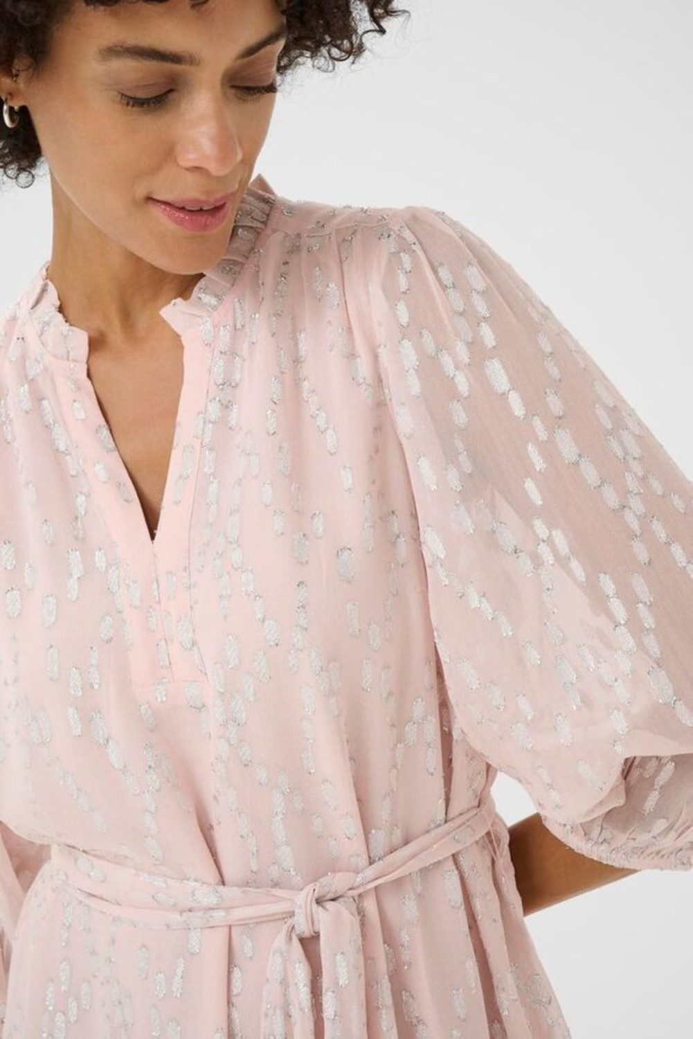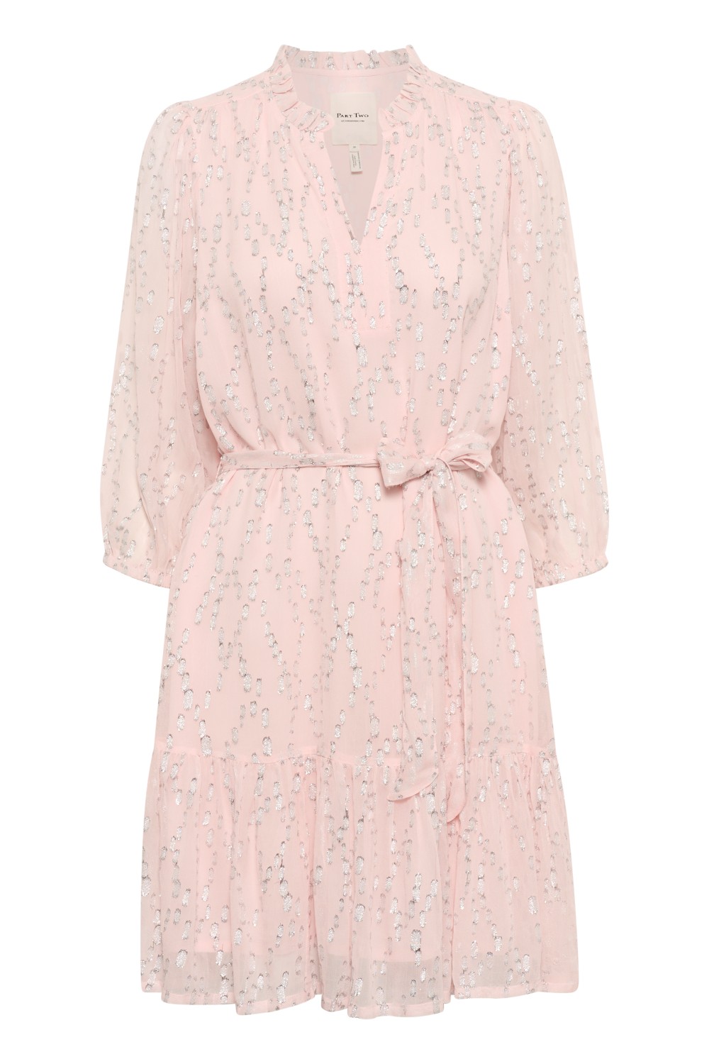«Tannie» fra Part Two er en kort lys kjole med et subtilt mønster i lurex. Den har 3/4-ermer, V-hals og knytebelte i livet som fremhever fasongen.