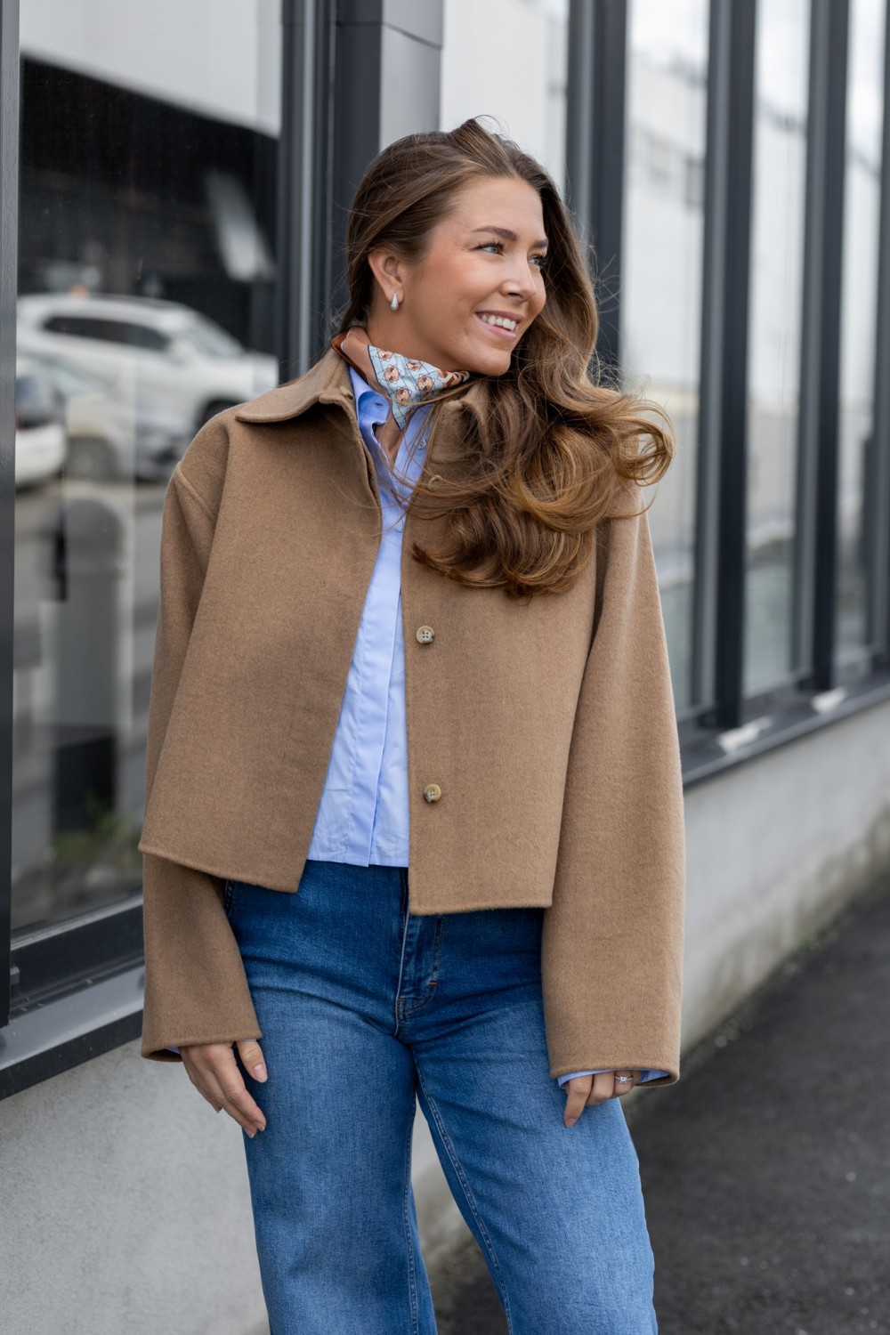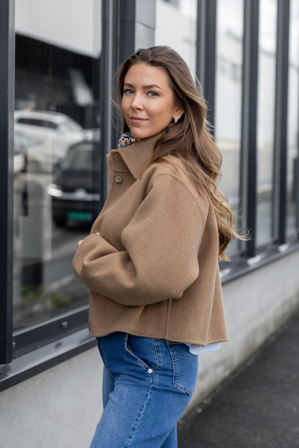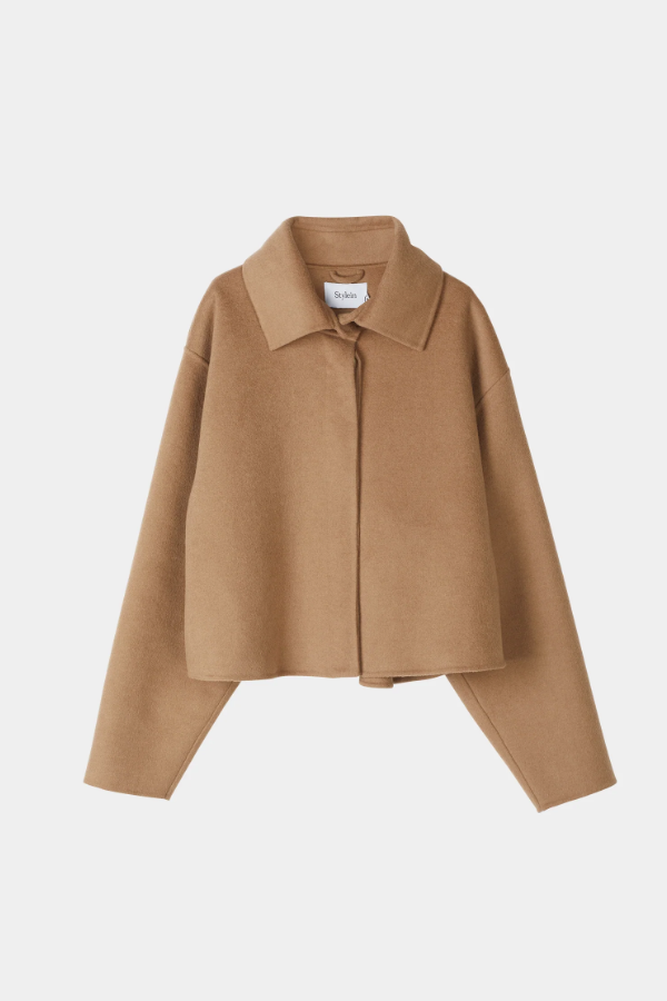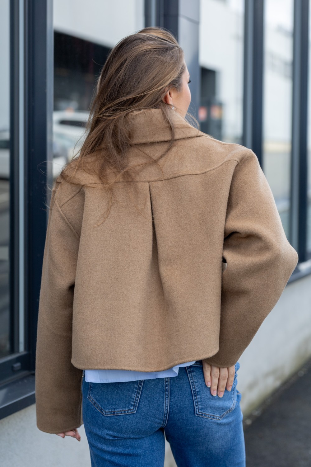 Teano fra Stylein er en kort, kamelfarget jakke i ullblanding med et strukturert og tidløst uttrykk. Den har Styleins karakteristiske boksfold i ryggen, vide ermer og en markert krage med festedetaljer. Jakken lukkes med skjulte knapper i front for en ren og elegant finish.