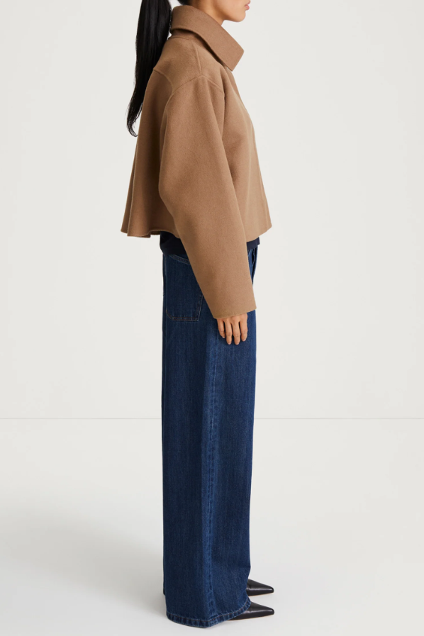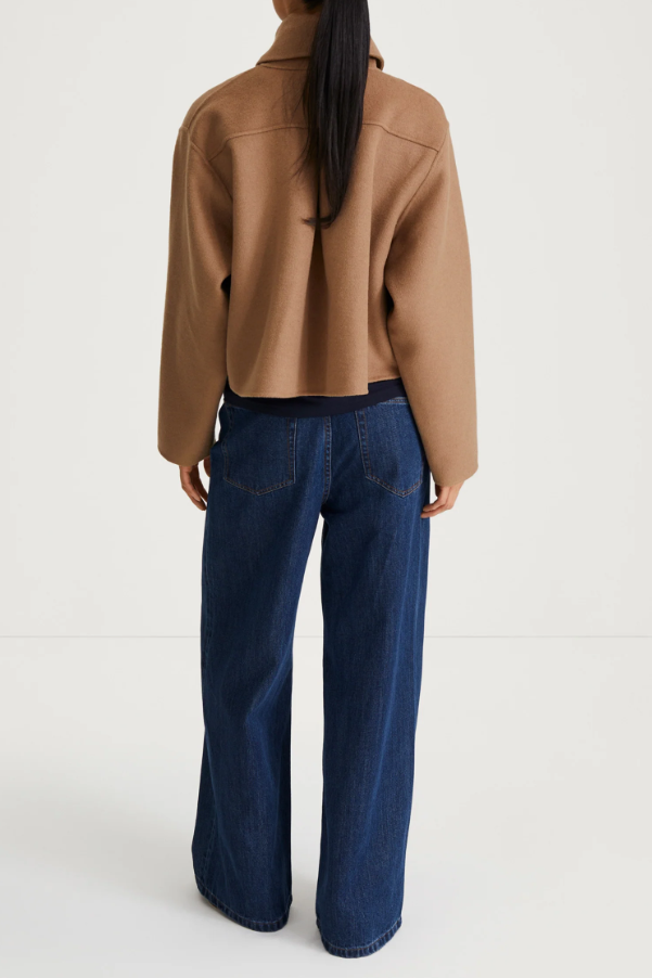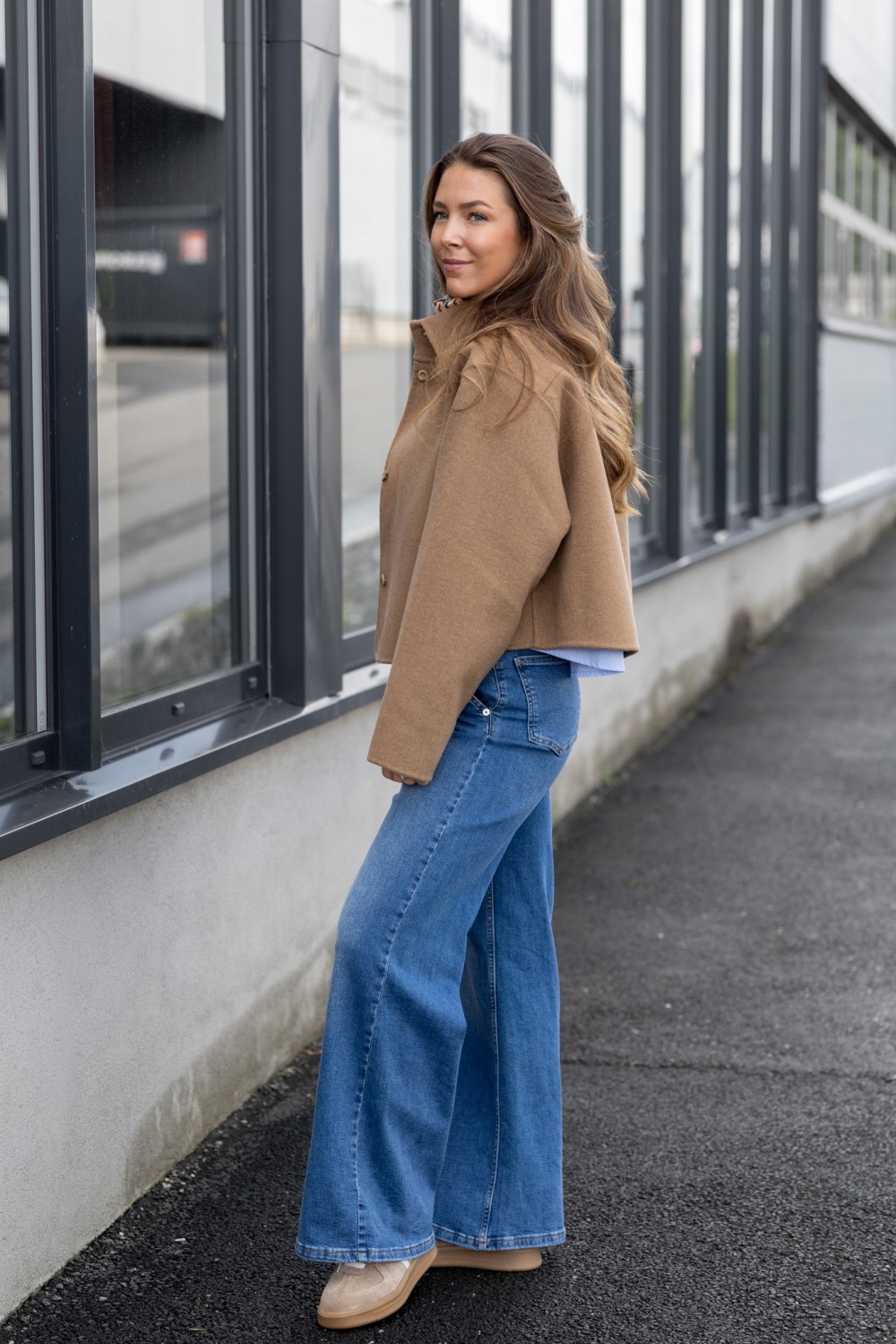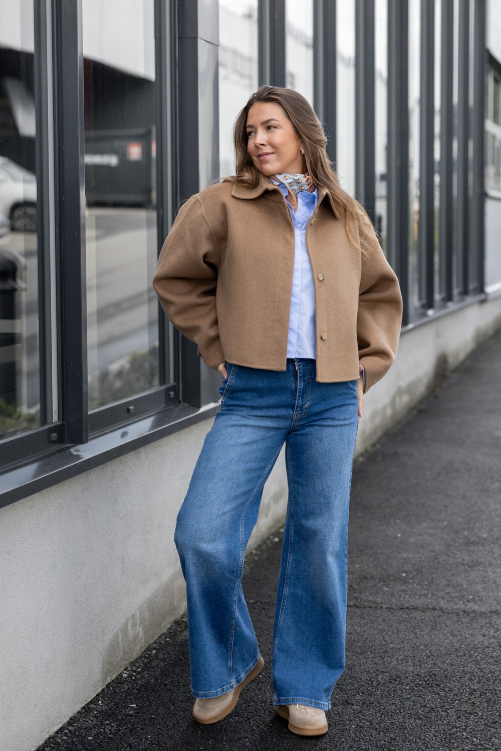 Teano fra Stylein er en kort, kamelfarget jakke i ullblanding med et strukturert og tidløst uttrykk. Den har Styleins karakteristiske boksfold i ryggen, vide ermer og en markert krage med festedetaljer. Jakken lukkes med skjulte knapper i front for en ren og elegant finish.
