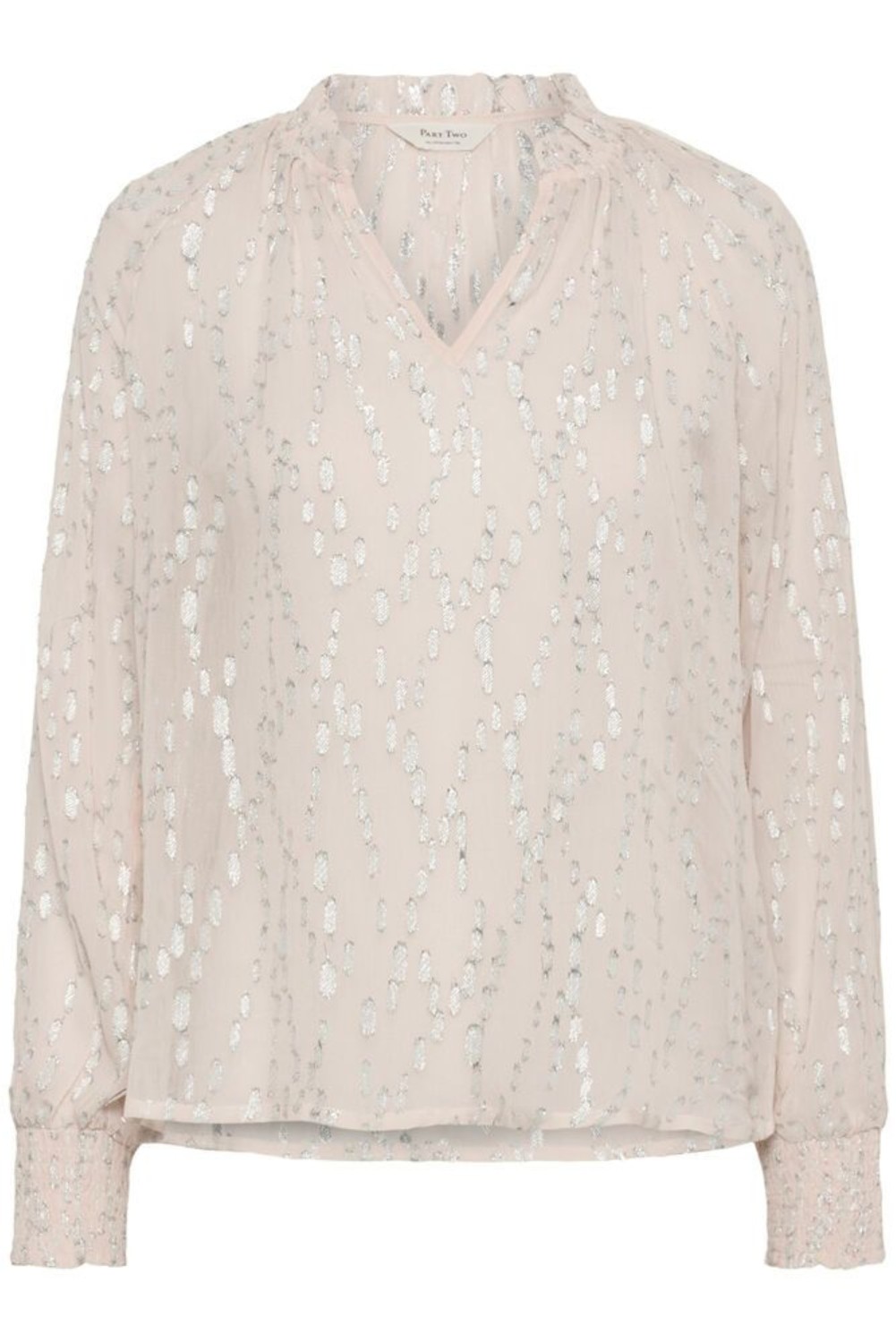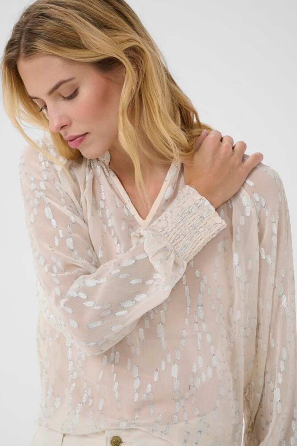 «Teia blouse» fra Part Two er en lett bluse i et delikat, semitransparent stoff som har et diskret mønster i lurex og en myk V-utringning som gir et feminint uttrykk. De lange ermene med smockdetaljer gir en avslappet silhuett.