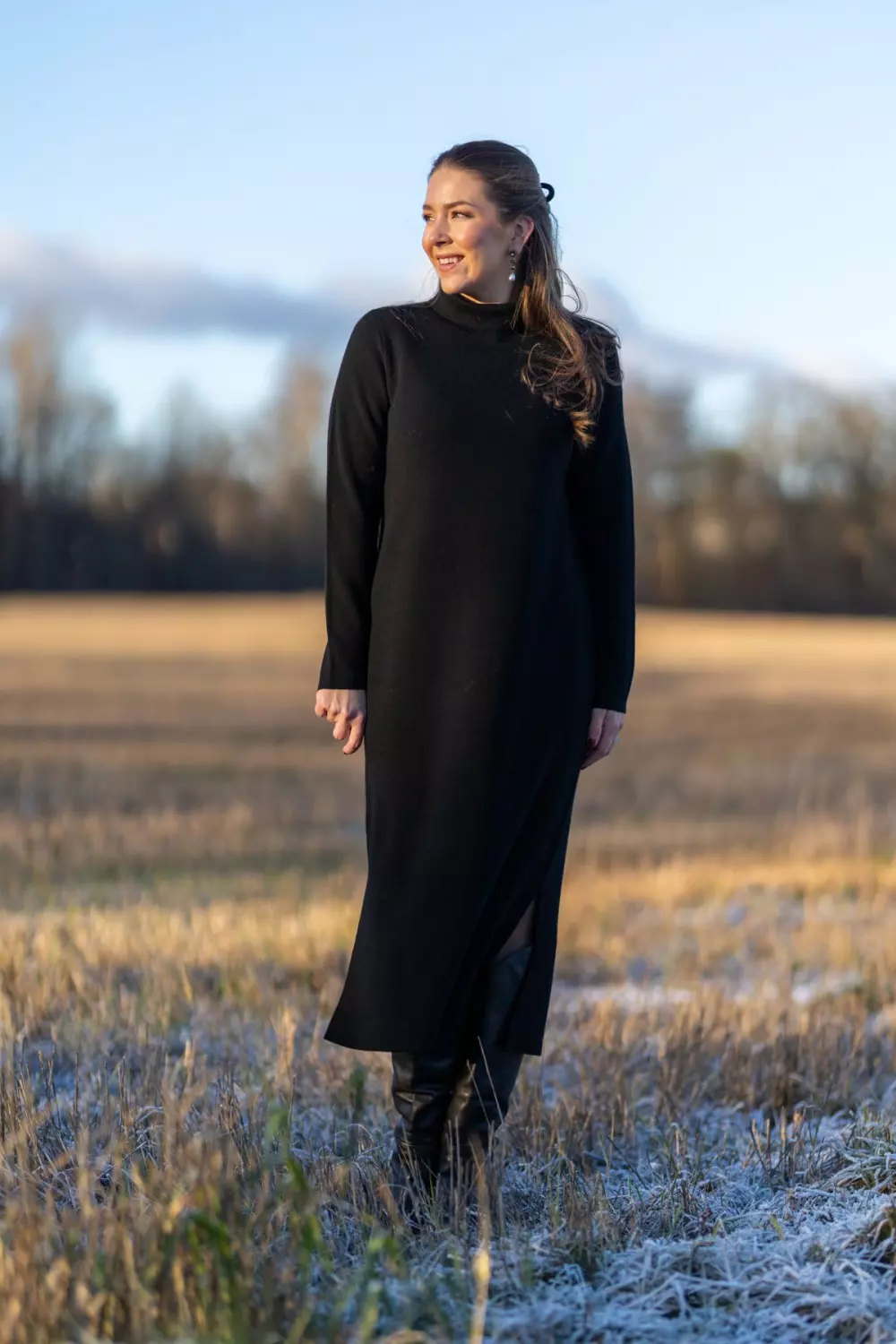 «Thea Dress» fra norske Amuse by Veslemøy er en mellomlang kjole i myk, varmende merinoull. Den har en rett passform med splitter i siden, en liten hals og lange ermer. Et tidløst plagg som kombinerer komfort med stil.