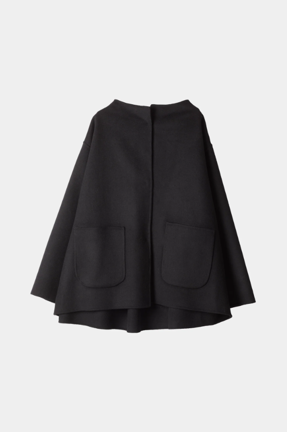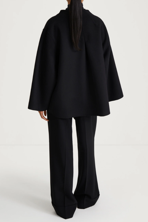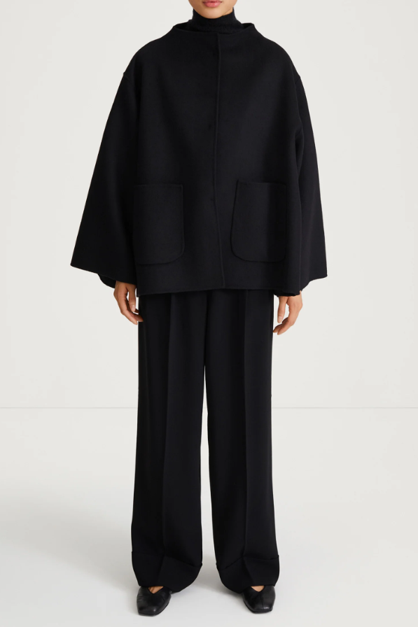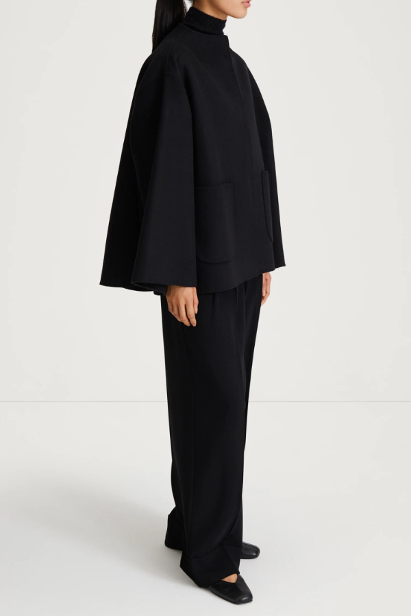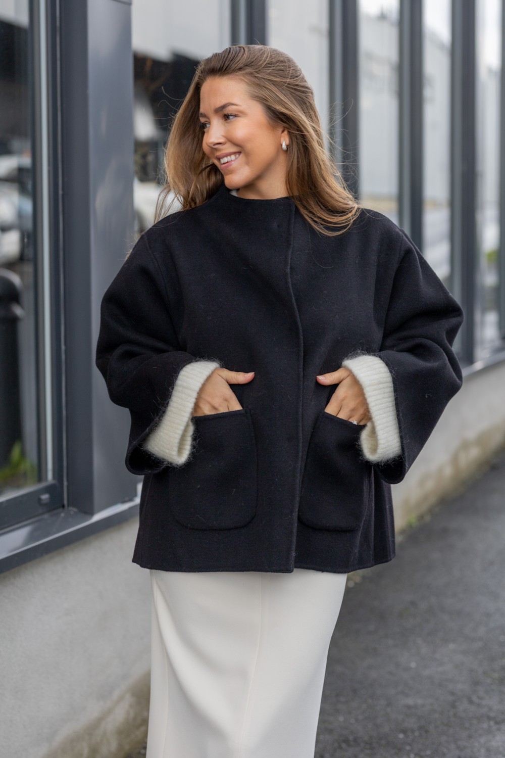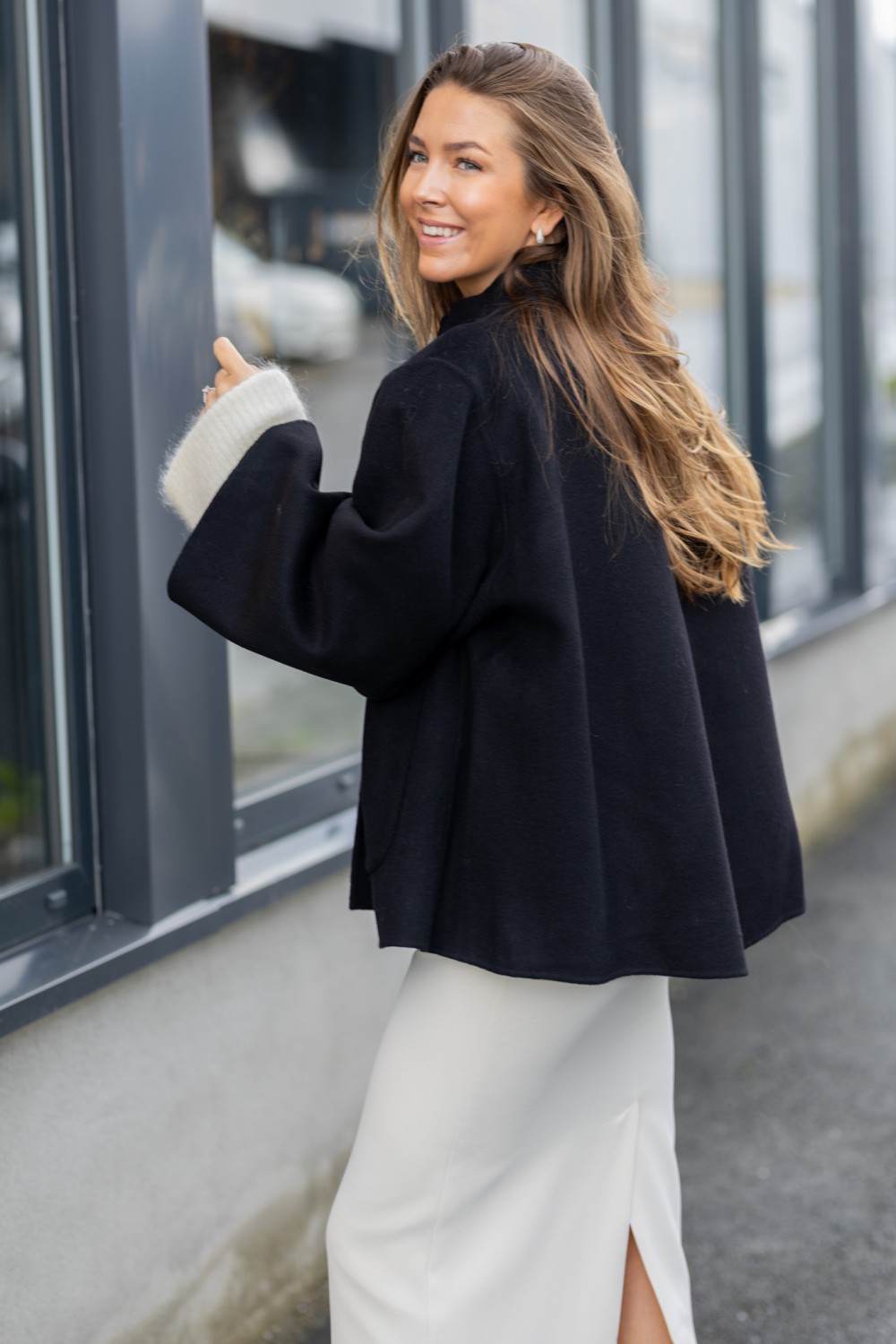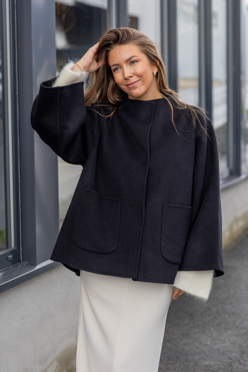 Tritsis Jacket fra Stylein er en elegant, voluminøs jakke i dobbeltsidig ullblanding med utsvingt silhuett. Den har en sømløs krage og vide ermer for et sofistikert uttrykk. Praktiske frontlommer og skjult knappelukking gir en stilren finish, perfekt til både hverdags og fest.