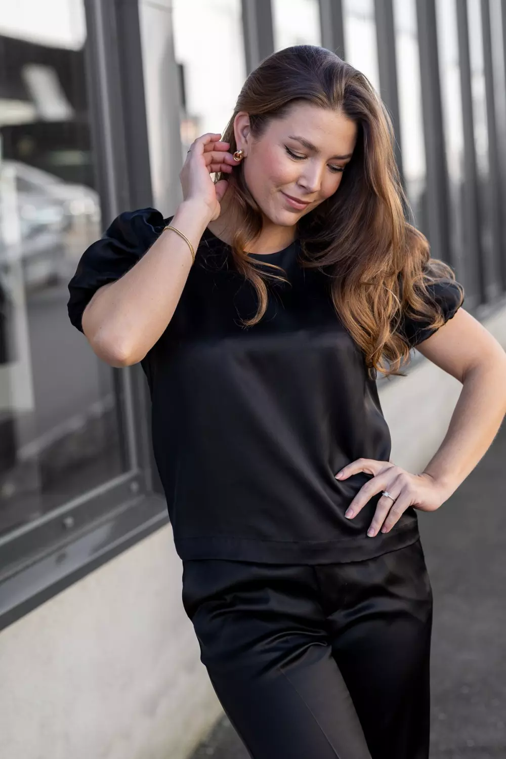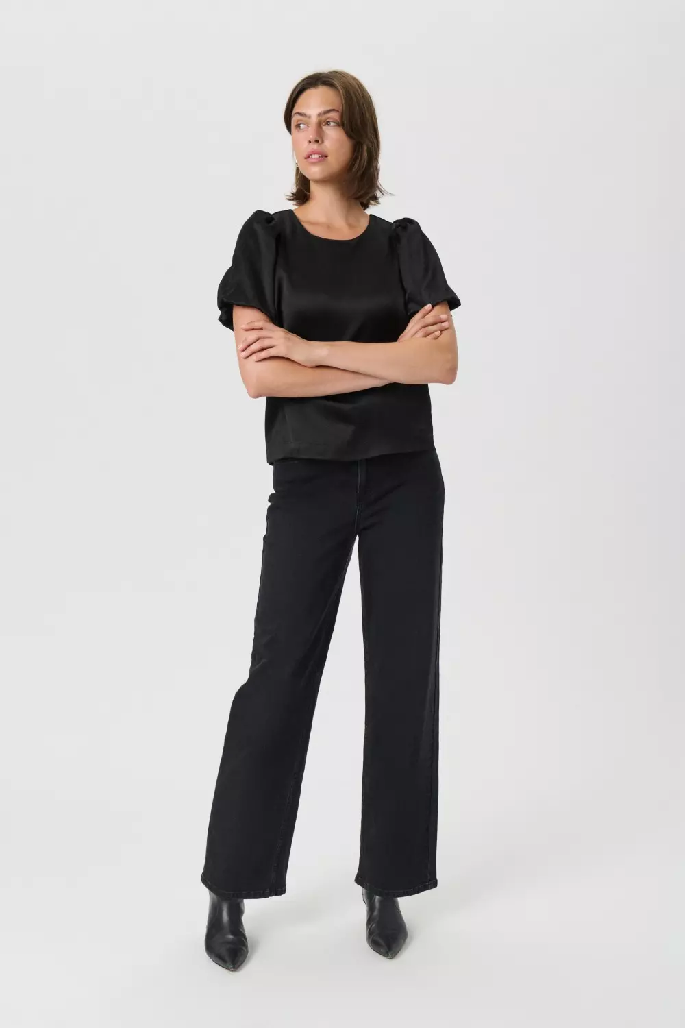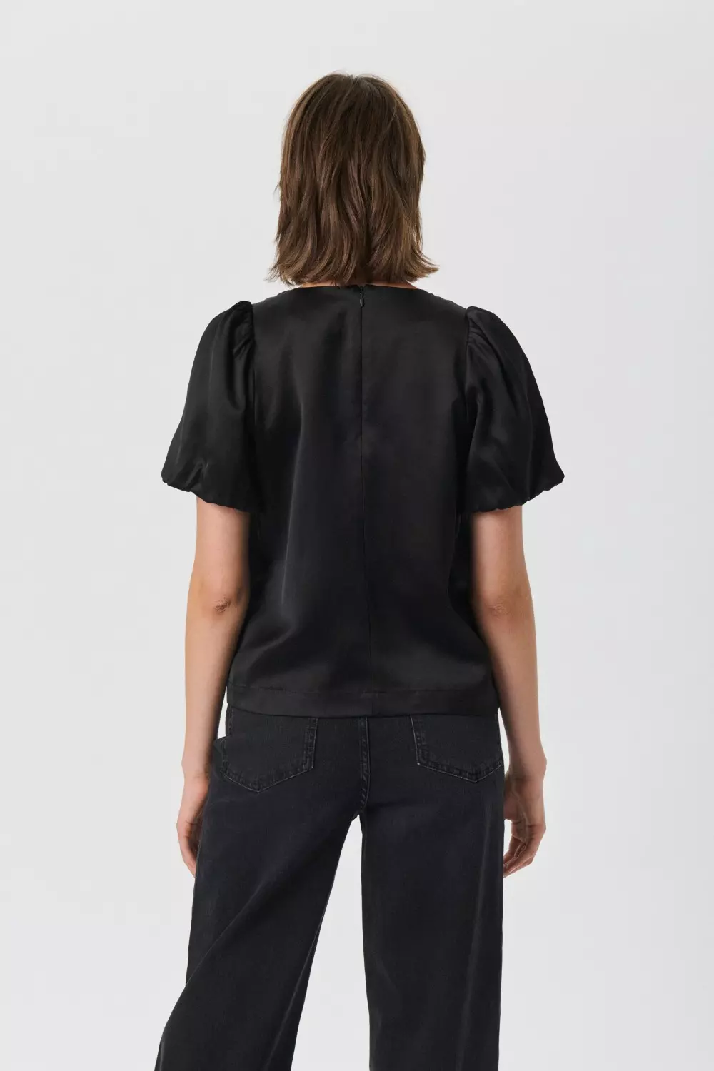 «Uria blouse» fra Part Two. En elegant sort satengbluse med korte puffermer. Blusen har en rund hals og en rett passform som gjør den enkel å style.