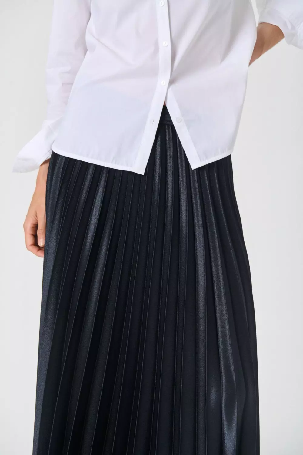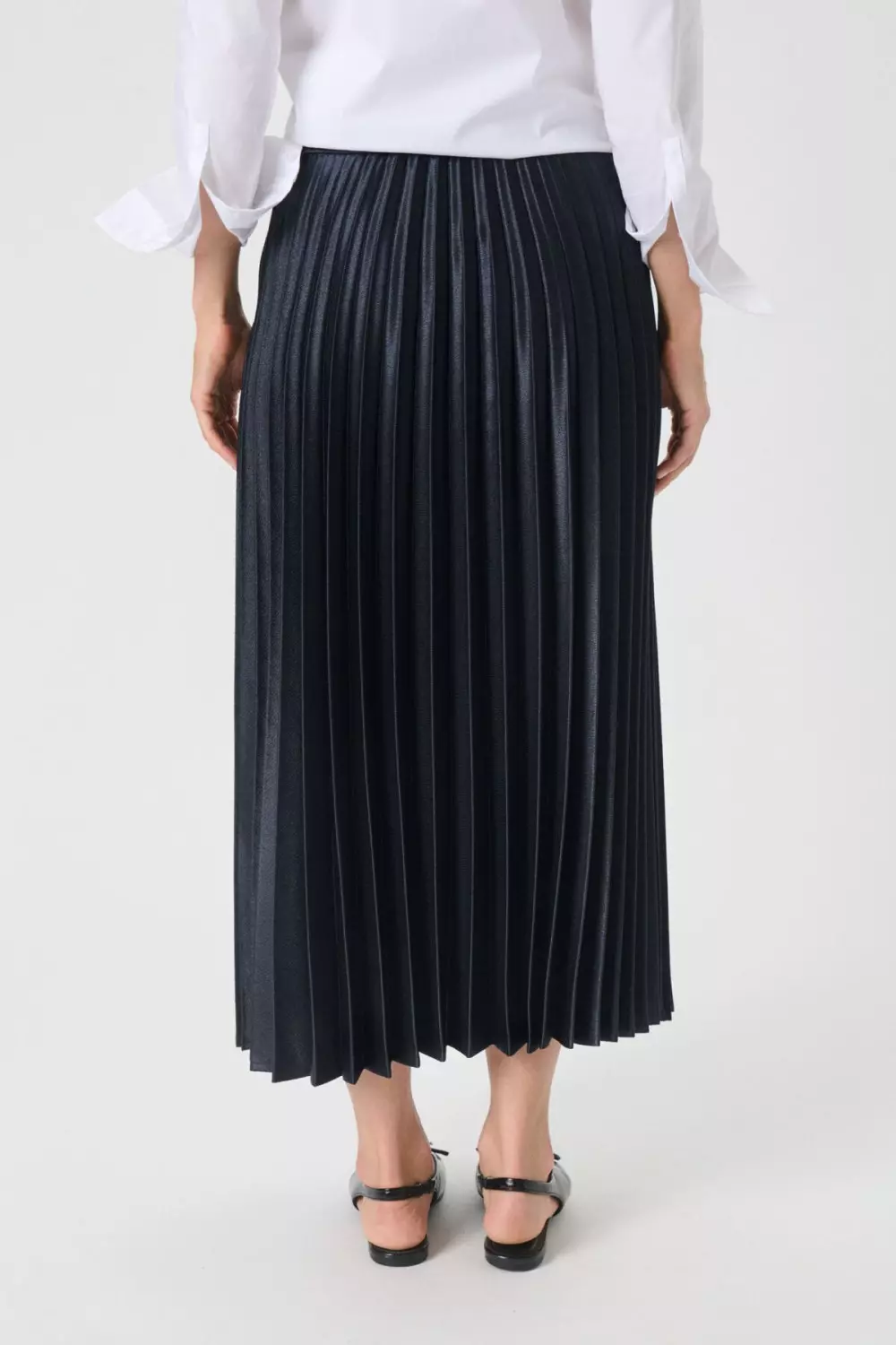 «Violetta skirt» fra Part Two er et plissert midi-skjørt i navy med lett glans og elastisk linning. De fine plissene gir et feminint uttrykk, og den myke kvaliteten gjør det behagelig å bruke. Passer like godt til hverdags som til fest.